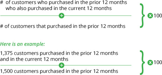 Measuring customer retention means looking at how many of your purchases came from existing and new customers over the past 12 months. Here’s how it is calculated: